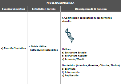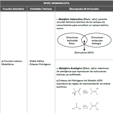 Por supuesto, estas tesis tienen una clara implicación nominalista, y algunas de sus consecuencias epistemológicas se muestran en la investigación (Horta, 2014) realizada en el posgrado de Filosofía de la Ciencia (UNAM), vinculado con la Facultad de Ciencias de la misma universidad. Una de las observaciones relevantes en dicho trabajo puede enunciarse de la siguiente manera: un modelo, en la ciencia, construye las condiciones de observación que permiten imaginar la existencia de entidades y procesos inobservables. En concreto, en el análisis semiótico del modelo de ADN propuesto por Watson y Crick (1953), se muestra cómo la estructura helicoidal permite observar-imaginar, y desde ahí explicar, el proceso de replicación molecular que, en principio, no tiene una clara correspondencia empírica.