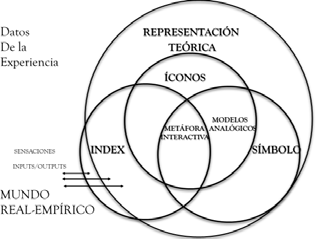 Siguiendo la nomenclatura de Magariños (1996), este proceso de semiosis construye la realidad concebible del fenómeno, a partir de las instancias sígnicas (ícono/índice/símbolo) como operaciones que permiten representar-interpretar el fenómeno como un texto semiótico. En la siguiente figura se esquematizan las fronteras de dicho proceso: