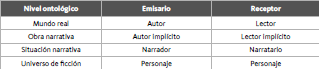 Este modelo de comunicación lingüística tiene importantes repercusiones para el estudio de la construcción de significado narrativo. En la concepción estructuralista en la que se apoya la teoría narrativa clásica, las figuras de emisor y destinatario se despliegan en varios niveles de existencia, como se refleja en la tabla 1. Estos niveles de existencia se consideran impermeables entre sí (Chatman, 1978; Onega y García Landa, 1996: 10; Rimmon-Kenan, 2002: 86), de modo que no es posible considerar que un narrador tiene como destinatario al lector, pues este tiene existencia en un nivel ontológico diferente.
