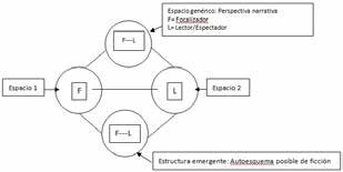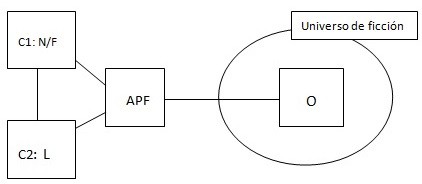 En otras palabras, en el caso del discurso narrativo, la composición visual intersubjetiva añade un APF a los dos sujetos de conceptualización ya presentes en la figura 1. Este actúa como referente mental híbrido de aquellas expresiones que implican la actividad cognitiva conjunta de un narrador-focalizador como perspectivizador interno (conceptualizador 1) y un lector como perspectivizador externo (conceptualizador 2). Esta configuración (figura 2) permite explicar los fenómenos de interacción cognitiva e intersubjetividad que tienen lugar entre estos dos tipos de entidades, aun en ausencia de interacción verbal. Se trata, por tanto, de un proceso de construcción de significado específico en discurso narrativo que no afecta la visión dialógica estructuralista de niveles ontológicos, sino que simplemente la trasciende para reflejar con mayor exactitud la interacción cognitiva que caracteriza la comunicación narrativa.