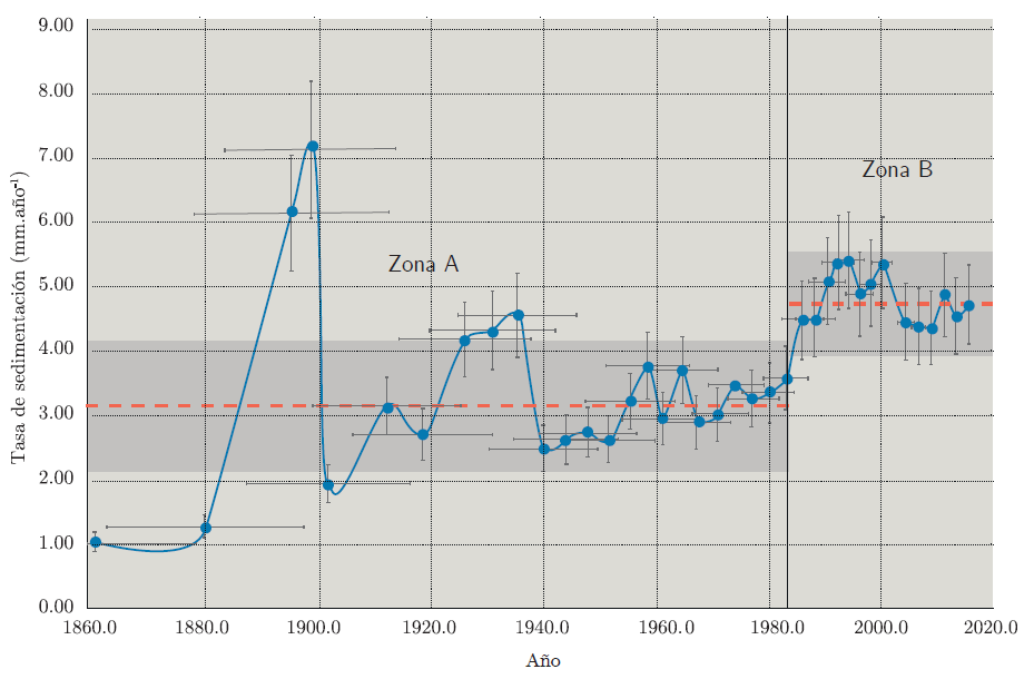 En base al modelo de datación mediante CRS se pudo calcular la tasa de sedimentación. En la Figura 9 se presenta un gráfico de dicha tasa de sedimentación en función del tiempo. En el mismo se observan dos zonas con tasas de sedimentación diferentes, pero a la vez aproximadamente constantes para cada período. Específicamente, en una zona inferior (Zona A), estimada desde 1870 (límite inferior de confiabilidad para dataciones actuales por 210Pb) hasta 1986, de 3.1 ± 1.5 mm/año-1, y una zona superior (Zona B), desde 1986 hasta el 2018, de 4.7 ± 0.8 mm/año-1. Dichas tasas de sedimentación son calculadas como la media de las tasas de sedimentación en cada zona, representadas en el gráfico de la Figura 9 como líneas de trazo rojo, punteado. Asimismo, los intervalos de confianza son calculados como el doble de la desviación estándar de las tasas de sedimentación, y son representados en el gráfico como zonas grises. El incremento de sedimentación reflejado entre las zonas A y B del gráfico se explica por la tendencia histórica creciente de precipitación total anual, según indican los datos climáticos históricos de la estación pluviométrica Rocha, donde se observan precipitaciones menores a 900 mm/año-1 hasta la década de 1980, y mayores a 1100 mm/año-1 a partir de la misma (García-Rodríguez, 2002).