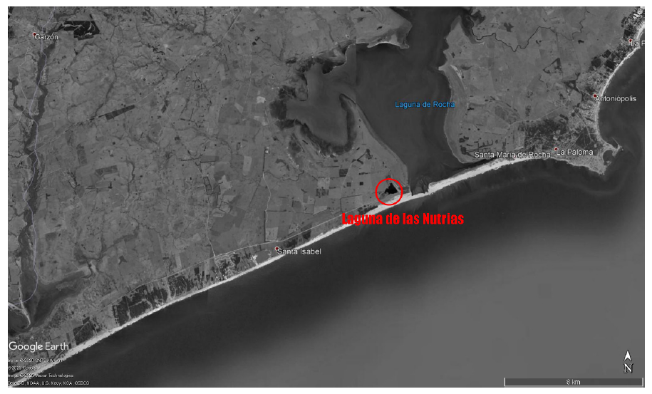 El muestreo fue realizado en febrero de 2018 en la Laguna de las Nutrias, Rocha, Uruguay (Figura 1), laguna natural de 33.8 ha de área, con una cuenca de 44.7 ha y una profundidad máxima de 1.5 m. Se trata de una laguna somera, de agua dulce y turbia, desarrollada sobre depósitos de la Formación Laguna Merín, con un alto nivel de eutrofización según sus niveles de nitrógeno y fósforo (Kruk, et al., 2006, 2009). La elección de este sistema léntico se basa en sus características sedimentológicas e hidrodinámicas, la cuales aseguran la decantación y ausencia de mezcla de sedimentos (al no contar con afluentes, solamente incorpora agua mediante precipitación pluvial y escorrentía). Asimismo, la laguna está alejada de actividades antrópicas de gran porte que generen perturbaciones de importancia (Sánchez-Cabeza, et al., 2012). Se tomó un testigo vertical de sedimento de 65 cm de longitud en la zona de mayor profundidad y libre de colonización masiva de macrófitas de la laguna, de forma manual, empleando para ello un tubo de cloruro de polivinilo (PVC) de 150 mm de diámetro interno (coordenadas de muestreo 34º40’50.8’’ S, 54º17’42.0’’ O). Se inmovilizó la interfase agua-sedimento mediante el empleo de espuma fenólica saturada en agua (espuma floral) previo al sellado, y se dispuso la columna de sedimento de forma horizontal, de manera de evitar la compactación y movimiento de agua intersticial (García-Rodríguez, 2002). El testigo de sedimento fue almacenado a 4ºC hasta el momento de su apertura.