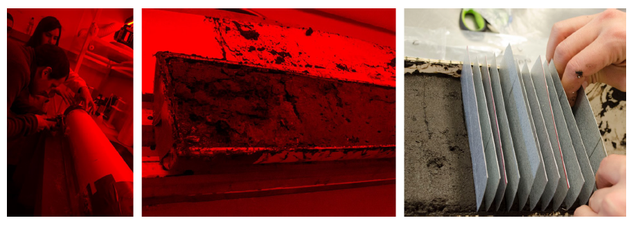 El testigo fue abierto de manera longitudinal, y luego fraccionado de forma transversal cada 1 cm, desde la superficie hasta los 30 cm de profundidad, y cada 2 cm, desde los 30 cm hasta el final (Figura 2).