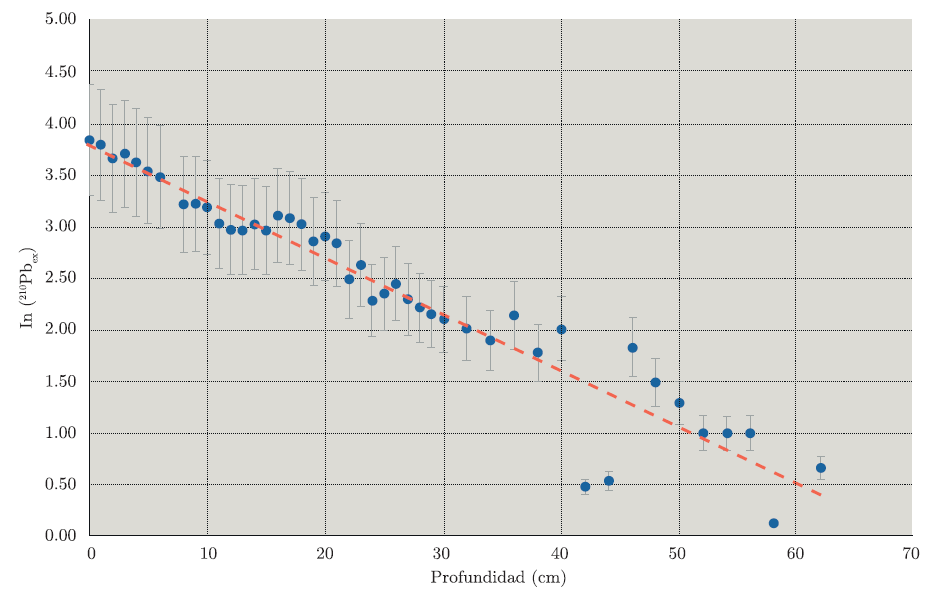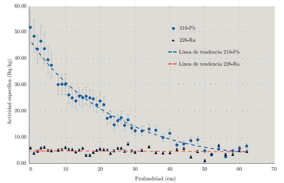 La actividad específica del226Ra oscila en base a una actividad constante, ya que la misma depende únicamente del decaimiento radiactivo de la serie natural del 238U. Para el 210Pb, se observa un decaimiento exponencial con la profundidad, hasta valores de actividad de 210Pb constantes, actuando en la parte exponencial el decaimiento radiactivo del 210Pb depositado por precipitación pluvial (210Pb en exceso). Podría afirmarse que la base constante constituye únicamente la actividad del 210Pb proveniente del decaimiento de la serie del 238U en el mismo sedimento (210Pb base) (Sánchez-Cabeza, et al., 2012). Este comportamiento pseudo-constante a tiempos cortos se debe al equilibrio secular existente entre el 210Pb y el 226Ra encapsulado en el sedimento. Restando ambas contribuciones, puede calcularse la actividad del 210Pbex, la cual es presentada en la Figura 4 para todo el testigo.
