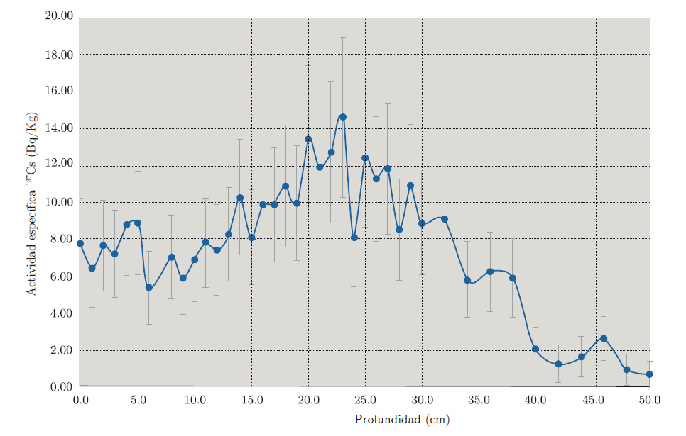 Los corrimientos de las fechas con respecto a los eventos señalados pueden deberse a dinámicas de transporte atmosférico, ya que una vez que alcanzan la atmósfera, los radionucleidos demoran desde meses hasta años en transportarse, hasta finalmente depositarse en el sedimento. Los fenómenos de distribución se dan primero a nivel troposférico, extendiéndose dentro del mismo hemisferio, por vientos, y luego, a nivel estratosférico de manera global, por difusión y decantación. La presencia de valores de 137Cs mayores a 0 desde 1900 y su crecimiento hacia los años donde encontramos los máximos se deben a movilidad vertical post-deposición de dicho radionucleido en el sedimento (Foster, et al., 2006). Las incertidumbres presentadas en dicho gráfico son, en el eje X las correspondientes a las dataciones realizadas según el modelo CRS, y en el eje Y calculadas de forma análoga a las de los demás radionucleidos medidos.