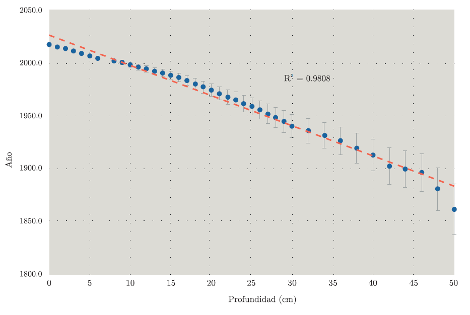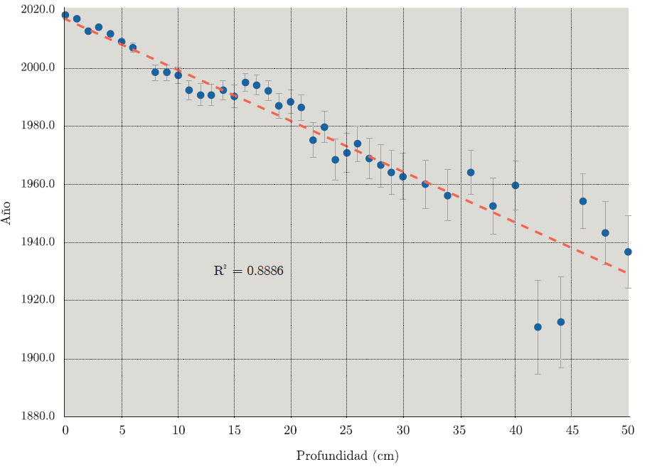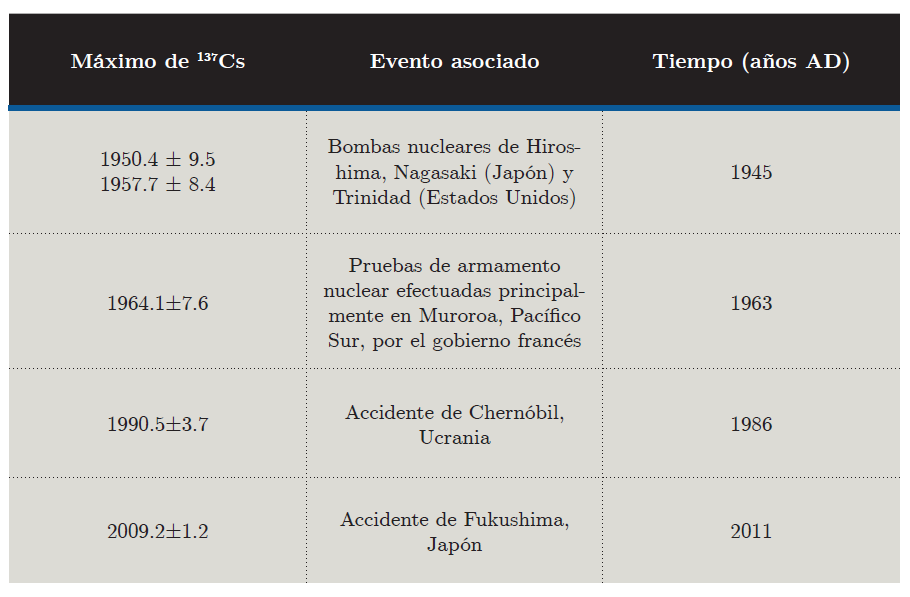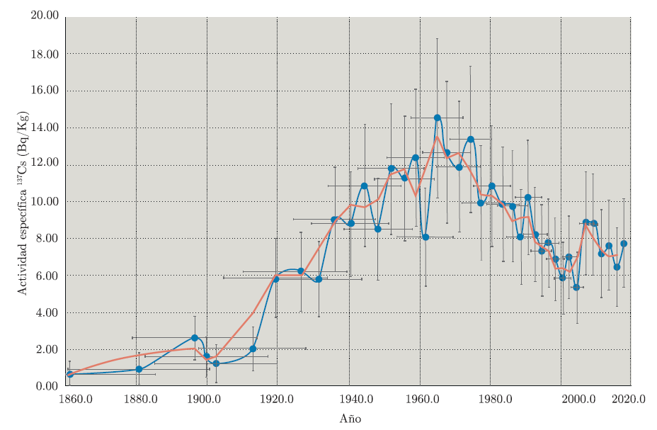 En la Figura 8 se representa un gráfico de actividad específica de 137Cs para cada sección del testigo, en relación a la datación realizada mediante el modelo CRS. En trazo azul de dicha figura se grafica la actividad específica de 137Cs, de origen antrópico, generado por fisión nuclear y liberado al ambiente en accidentes nucleares o pruebas de armas nucleares. Además, en trazo rojo se muestra la línea de tendencia suavizada según la media móvil cada 2 puntos. En dicha figura se pueden encontrar diversos máximos, correspondientes a procesos de fisión como los anteriormente mencionados, que se dieron en diferentes lugares del planeta; los de mayor importancia son presentados en la Tabla 1.