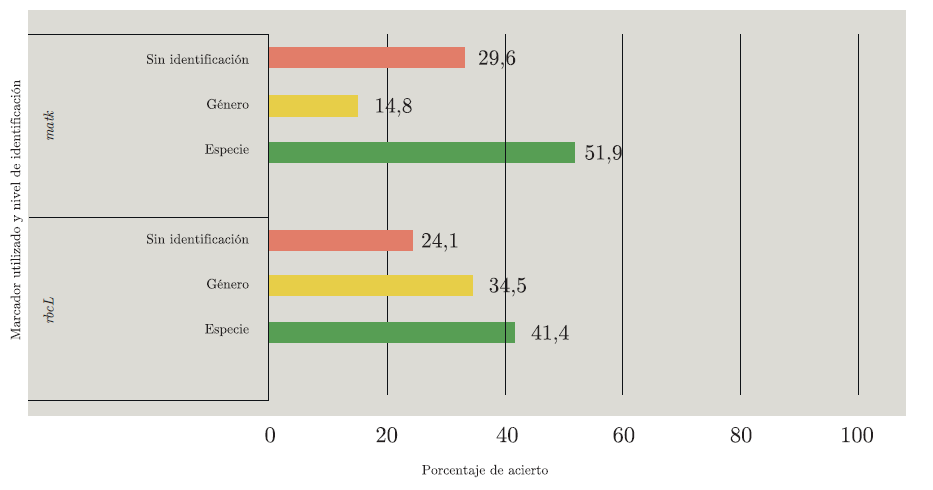 De los 29 haplotipos rbcL obtenidos para las muestras de referencia, 12 pudieron asignarse correctamente a nivel de especie, 10 a nivel de género y 7 a nivel de familia. Esto representa un 41,4% de asignación correcta a nivel de especie. De los 27 haplotipos matK obtenidos para las muestras de referencia, 14 pudieron asignarse correctamente a nivel de especie, 4 a nivel de género y 9 a nivel de familia. Esto representa un 51,9 9% de asignación correcta a nivel de especie. En la Figura 1 se pueden observar los porcentajes de acierto en la identificación por región, tanto a nivel de especie, género o aquellos ejemplares que no pudieron identificarse.