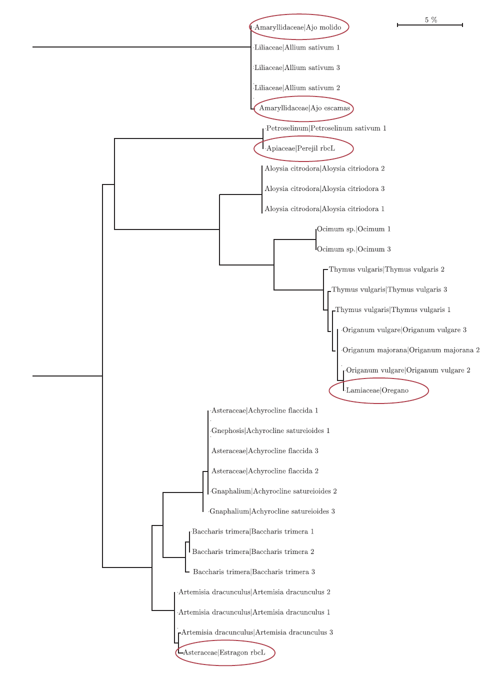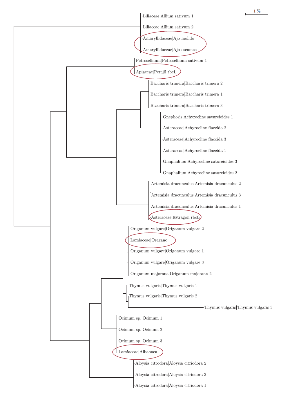 Las secuencias rbcL se agruparon correctamente por género (Figura 2). En aquellos géneros donde se analizó más de una especie, como Achyrocline y Origanum, las distintas especies fueron agrupadas en el mismo cluster. Las secuencias correspondientes a las muestras comerciales coincidieron con los clusters de las especies declaradas en cada caso.