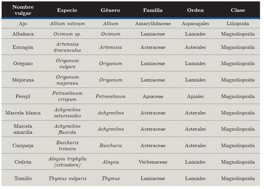 Las especies incluidas en este trabajo se describen en la Tabla 1. Se utilizaron tres ejemplares de cada especie, excepto Origanum majorana y Petroselinum crispum, de las cuales se obtuvo una sola muestra. Los ejemplares fueron proporcionados por el Instituto Nacional de Investigación Agropecuaria (INIA), de su colección de germoplasma vinculada al proyecto FPTA N° 137 Desarrollo del sector de las plantas medicinales y aromáticas en Uruguay (Davies, 2004). Fueron usados como muestras de referencia por tener identificación taxonómica.