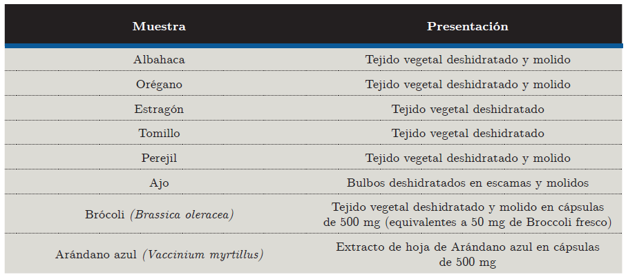 Además, se incluyeron muestras comerciales de algunas de las especies en estudio con el objetivo de evaluar la metodología en muestras problema. Las mismas fueron proporcionadas por el Departamento de Análisis de Productos Agropecuarios del LATU y por una empresa del ramo (Tabla 2).