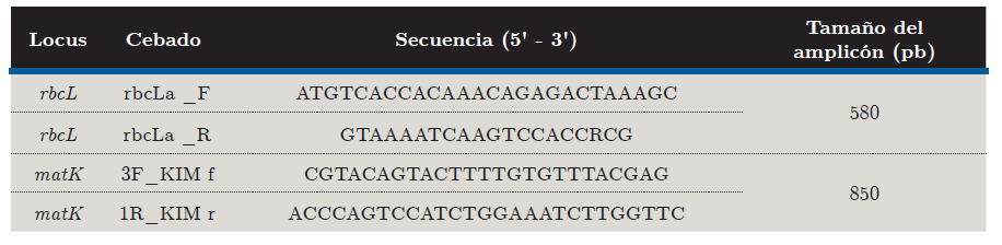 Se amplificaron las regiones cloroplásticas rbcL y matK utilizando los cebadores diseñados por Erickson y Kim respectivamente, y cuyas secuencias se describen en la Tabla 3 (CBOL Plant Working Group, 2009).