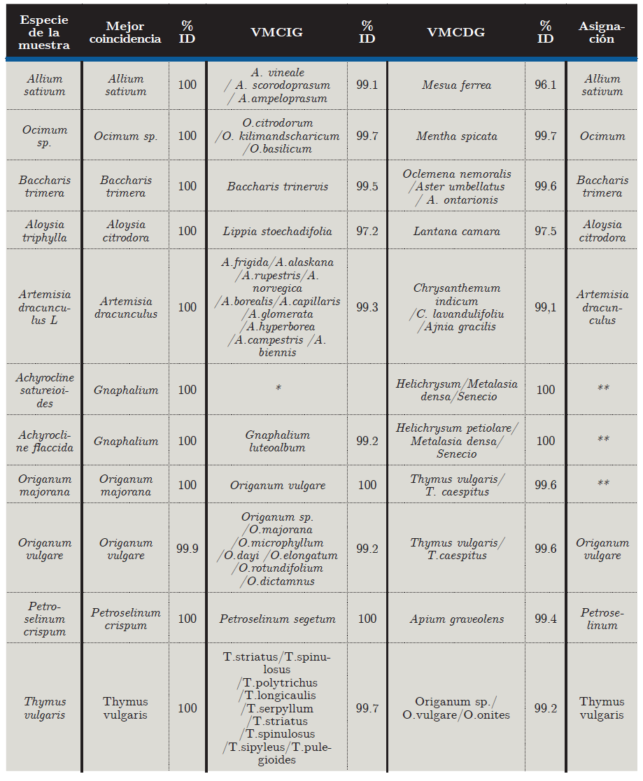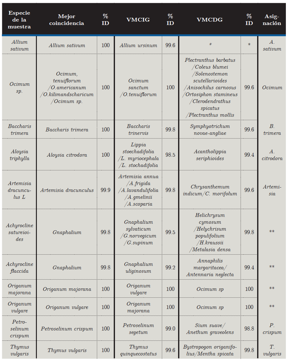 Con respecto a la amplificación de la región rbcL, con el protocolo puesto a punto se analizaron 29 muestras de referencia (tejido fresco) pertenecientes a las familias Amaryllidaceae, Apiaceae, Astereaceae, Lamiaceae, Verbenaceae. En todos los casos se obtuvieron productos de amplificación del tamaño esperado. Fueron analizadas 9 muestras industrializadas de origen comercial de perejil, tomillo, albahaca, estragón, orégano, ajo en escamas, ajo molido, brócoli y arándano en las presentaciones que se detallan en la Tabla 2. En todos los casos se obtuvieron productos de amplificación, excepto a partir de la muestra de arándano que no amplificó. Este hecho era de esperar ya que en la extracción se obtuvo poco ADN y de baja pureza. De acuerdo con los resultados obtenidos podemos corroborar que los cebadores rbcLa_f y rbcLa_rev funcionan adecuadamente en nuestras condiciones de trabajo y para las especies estudiadas.