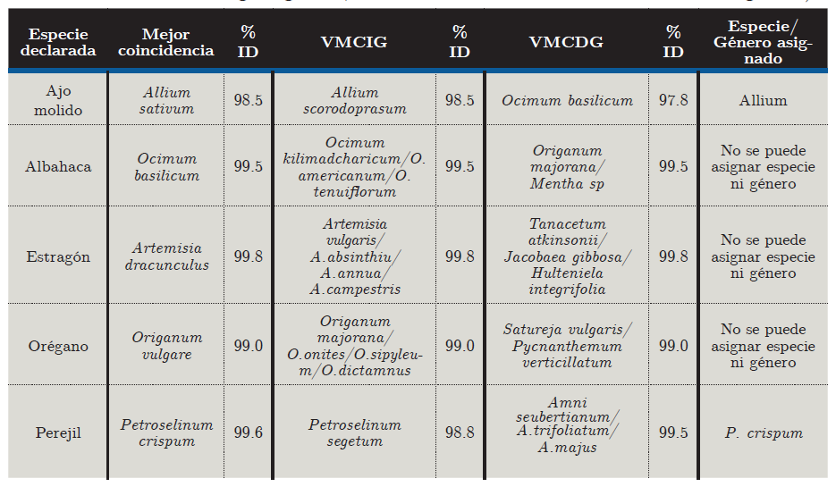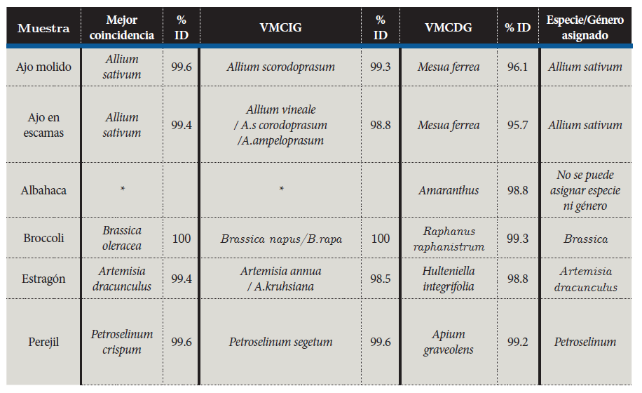 El mismo procedimiento fue realizado con las muestras comerciales. Los resultados obtenidos se presentan en las Tablas 6 y 7. Como puede observarse, con ambos marcadores la mejor coincidencia para la muestra de ajo molido corresponde a la especie declarada por el fabricante. Lo mismo sucedió con el ajo en escamas con el marcador matK. La muestra de estragón no pudo asignarse correctamente usando el marcador rbcL, pero con matK la asignación coincidió con la especie declarada. Con la muestra de perejil la situación fue la inversa, rbcL fue más eficiente para permitir la asignación que matK. El brócoli en cápsulas pudo asignarse correctamente a nivel de género, pero no de especie. Tanto la albahaca como el orégano no pudieron diferenciarse de otras especies pertenecientes a la familia de las Lamiaceas mediante el uso de estos marcadores.