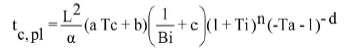 Donde tc, pl es el tiempo de congelación de una placa plana en s; α, la difusividad térmica del producto sin congelar (α=k/ρcp), en m2/s; L, el semiespesor de la placa en m; Ti, la temperatura inicial; Ta, la temperatura del refrigerante (aire) y Tc la temperatura final a alcanzar en el centro térmico (generalmente -18 °C) expresadas todas en °C, Bi es el número adimensional de Biot. Las constantes, empíricas, dependen de la geometría. Para placa plana infinita a = -1,272; b = 65,489; c = 0,184; n = 0,096 y d = 1,070. Las condiciones de aplicación son: