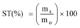 mi, masa inicial de muestra de batata fresca; mf, masa de muestra deshidratada osmóticamente a tiempo t; ms, masa de muestra seca; mo, masa de muestra antes de secar, H (%), porcentaje de humedad; ST0 y ST, contenido de sólidos totales iniciales y en el tiempo, respectivamente.