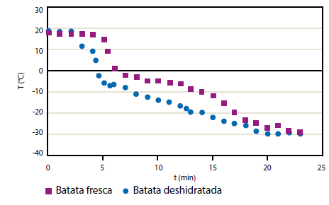 El Gráfico 8 exhibe las curvas de congelación correspondientes a la batata fresca y a la deshidratada osmóticamente. La velocidad de congelación es superior cuando se emplea el pretratamiento de DO (batata deshidratada), tal como puede observarse en las curvas de congelación (temperatura versus tiempo) de pendientes más abruptas en sus distintas zonas y en las que no se aprecian prácticamente zonas amesetadas como en el caso de las sustancias puras.
