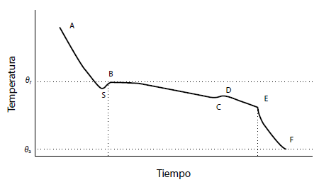 El tramo SB corresponde al momento en que el calor liberado durante la congelación de los primeros cristales es superior a la extracción de energía por parte del equipo, por ello se produce en la curva un leve aumento de temperatura desde el subenfriamiento S hasta el comienzo de la etapa de cambio de fase B.