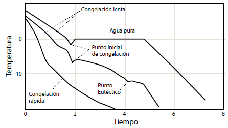 Las curvas de enfriamiento difieren entre una sustancia pura y un alimento (Figura 1). En el caso de una sustancia pura existe una zona de meseta para el cambio de fase. Sin embargo, para un alimento el cambio de fase no se produce a temperatura constante. Se presenta una cierta pendiente, la cual se hace más abrupta a medida que incrementa la velocidad de congelación.