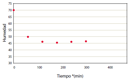 A partir de los datos experimentales de humedad inicial (71%) y humedad final a t: 5 h (46%) se calculó la pérdida de agua en el equilibrio, que resultó ser 25%. Si se compara este valor experimental con el valor obtenido con el modelo de Azuara et al. (1992), 24,8%, el error diferencial porcentual es del 0,8% en defecto.