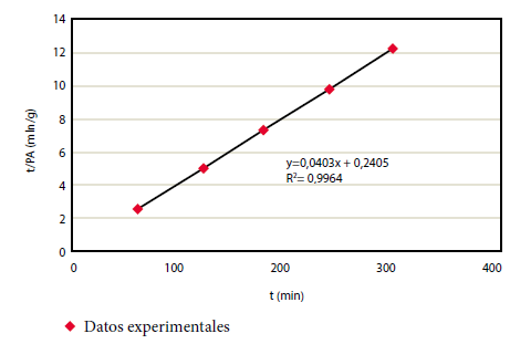 Se aplicó el modelo de Azuara et al. (1992) a los datos experimentales de pérdida de agua y se graficó el primer miembro de la ecuación, t/PA, en función del tiempo de deshidratación osmótica, t. En la Tabla 3 se exponen los parámetros correspondientes al modelo. En el Gráfico 3 se presentan los datos experimentales y su correspondiente ajuste con el modelo.