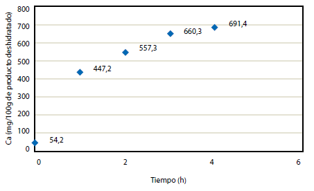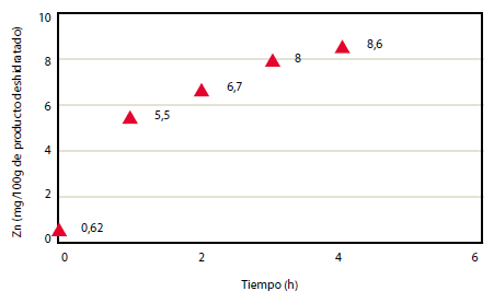 La absorción de minerales durante la deshidratación osmótica crece con el tiempo hasta alcanzar un valor máximo aproximadamente a las 4 horas. Asimismo, se puede apreciar que durante la primera hora se absorbe un 63-67% del valor máximo alcanzado. Esto se cumple tanto para el calcio como para el zinc.