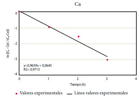 En los Gráficos 6 y 7 se presenta el ajuste del modelo de Crank (1975) a los datos experimentales de absorción de calcio y de zinc, respectivamente. En ellos se muestra también la ecuación y la bondad del ajuste, R2.