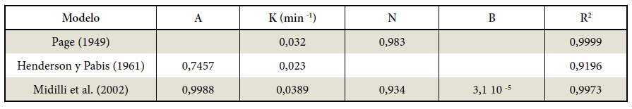 El parámetro N tanto en el modelo de Page (1949) como el de Midilli et al. (2002) se aproximan a 1. Los modelos de Page (1949) y Midilli et al. (2002) son los que ajustaron mejor los datos experimentales. Varios autores encontraron que el modelo de Midilli et al. (2002) describe muy satisfactoriamente la cinética de secado de frutas y vegetales (Onwude, et al., 2016).