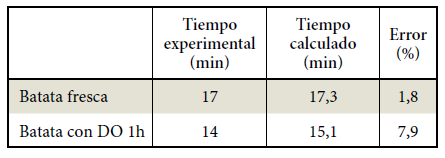 Los tiempos de congelación de la batata con y sin el pretratamiento de DO se estimaron muy satisfactoriamente aplicando el modelo de Salvadori-Mascheroni (1991) (Ecuaciones 21 y 23). En la Tabla 4 se presentan los valores de tiempos de congelación experimentales y calculados y sus respectivos errores. La batata deshidratada alcanza una temperatura de congelación final en menor tiempo que la batata fresca debido a que posee menor contenido de agua.
