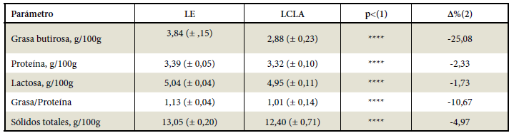 La composición química de la leche estándar (LE) y de la leche CLA (LCLA) se presenta en la Tabla 1.