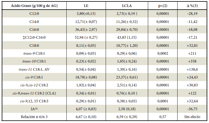 La concentración del CLA (Tabla 2) se incrementó en un 122% al comparar el valor en la LE (0,34 g/100g) al observado en la LCLA (0,77 g/100g). Dado que el AV y el CLA correlacionaron positivamente (r=0,85) y no se ha informado ninguna asociación de riesgo para el AV (Hodgson, et al., 1996) ni para el par AV/CLA (Roy, et al., 2007), estos parámetros deberán ser mejorados posiblemente mediante la inclusión adicional de una dosis baja de aceites poliinsaturados de girasol o soja.