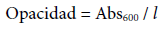 Se determinó la opacidad de las distintas películas siguiendo la metodología propuesta por (Siripatrawan y Harte, 2010). Se tomaron cinco muestras rectangulares (10 mm × 30 mm) de diferentes partes de una película y se ubicaron en el lado interno de una celda de espectrofotómetro Jasco V-500 (Jasco International Co., Ltd., Tokyo, Japan). La absorbancia de luz de las muestras de películas fue medida a una longitud de onda de 600 nm (Abs600). La opacidad se calculó usando la ecuación: