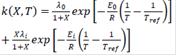 donde R es la constante de gases ideales, λ0(0.273 W/mK) y λi(0.8 W/mK) las conductividades térmicas a Tref=60 °C y humedades X=0 y X=∞, respectivamente; E0 y Eilas energías de activación para conducción de calor para X=0 y X=∞, respectivamente.
