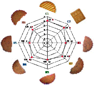 Como se muestra en la Figura 2, las formulaciones de galletas preparadas con stevia (B2), stevia y maltitol (B4) y maltitol (B6), que contienen en todos los casos fibra antioxidante de café y FOS en su formulación, obtuvieron puntuaciones significativamente mayores (p<0,05) que las respectivas galletas sin FOS (B1, B3 y B5). Los compuestos bioactivos, cafeína y glucósidos de esteviol, presentes en el café y la stevia, respectivamente, aportan un sabor amargo que persiste en boca (Hellfritsch, et al., 2012), pudiendo afectar negativamente la calidad sensorial del alimento. El retrogusto de los esteviósidos en particular es muy persistente, lo que limita su uso a determinadas concentraciones en muchos alimentos. Los FOS presentan un ligero dulzor que mejora significativamente (p<0,05) la calidad sensorial de los alimentos elaborados incluyendo en su formulación stevia y fibra antioxidante de café (B2, B4 y B6) como ingredientes. La incorporación de FOS en las galletas tiene un impacto positivo en la calidad nutricional del alimento. A los FOS se le atribuyen carácter prebiótico (Kumar, et al., 2012), efecto fibra (Sartori da Silva, et al., 2007) y capacidad de reducir la respuesta glicémica postprandial (EFSA, 2014). Por tanto, los FOS son un ingrediente esencial de la formulación de las nuevas galletas, dado que su incorporación solventa simultáneamente problemas de calidad sensorial y mejora el valor nutricional del alimento. Su adición podría tener impacto no solo en el sabor sino también en la textura del producto final (Ishwarya y Prabhasankar, 2013).
