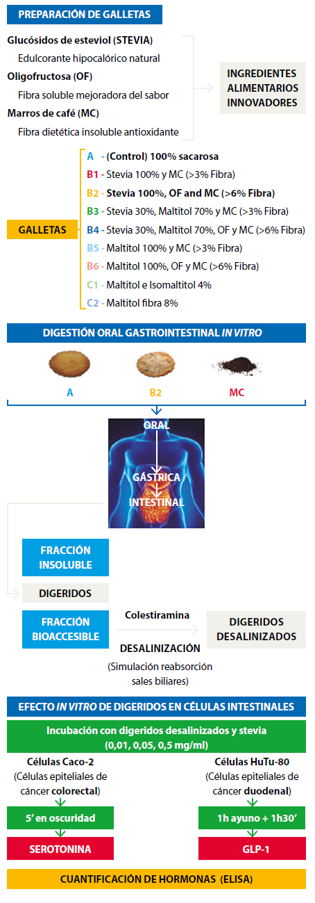 El plan de trabajo propuesto en este estudio se presenta en la Figura 1. Tal como queda reflejado en el esquema, se prepararon galletas a base de harina de trigo empleando como edulcorantes sustitutos del azúcar, maltitol y stevia, y como nueva fuente natural de fibra antioxidante de café un abundante subproducto de su procesado, marros de café (MC) (del Castillo, et al., 2014). Con el fin de obtener formulaciones de elevada calidad nutricional y sensorial, de acuerdo a las preferencias de los consumidores y con potencial para reducir el riesgo de enfermedades crónicas como la obesidad y la diabetes, se llevó a cabo en primer lugar un análisis sensorial de las galletas propuestas. Se obtuvieron fracciones bioaccesibles de estos nuevos alimentos e ingredientes digeridos mimetizando las condiciones fisiológicas humanas de la digestión oral gastrointestinal. Los efectos de estos digeridos sobre la liberación de hormonas intestinales, serotonina y GLP-1, implicadas en procesos de saciedad y de glucemia postprandial en líneas celulares intestinales (Caco-2 y HuTu-80, respectivamente), fueron evaluados. En la Figura 1 se describen los materiales y métodos empleados para la instrumentación del plan de trabajo.