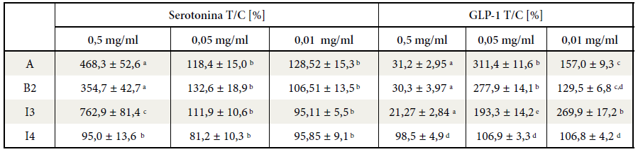 Liberación de serotonina y GLP-1, [%] frente al control (células no tratadas, 100%) por estimulación de células Caco-2 y HuTu-80 con las fracciones bioaccesibles de los digeridos de galleta control a base de sacarosa (A), de galleta con stevia, fibra antioxidante de café y FOS (B2), fibra antioxidante de café (I3) y stevia pura (I4), en concentraciones de 0,5, 0,05 y 0,01 mg/ml. Los resultados se expresan como la media SEM (n=3 sub-cultivos x 6 réplicas de cada uno = 18). Las letras diferentes indican la existencia de diferencias significativas entre los valores de todas las muestras analizadas para cada hormona en particular (ANOVA de una vía (p < 0,05)).