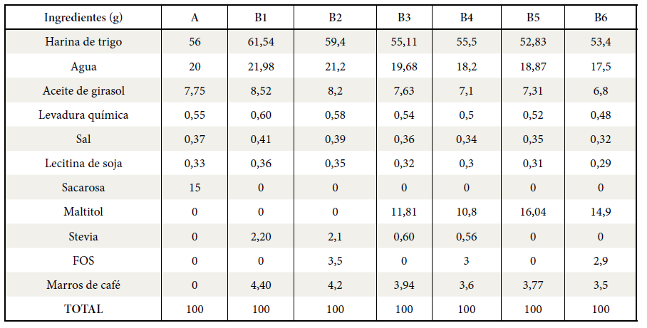 Formulaciones de las galletas: A- (control) con sacarosa; B1 - stevia 100% y marros de café (MC) (>3% Fibra); B2- stevia 100%, fructooligosacáridos (FOS) y MC (>6% Fibra); B3- stevia 30%, maltitol 70% y MC (>3% fibra); B4- stevia 30%, maltitol 70%, OF y MC (>6% fibra); B5- maltitol 100% y MC (>3% Fibra); B6- maltitol 100%, OF y MC (>6% fibra).