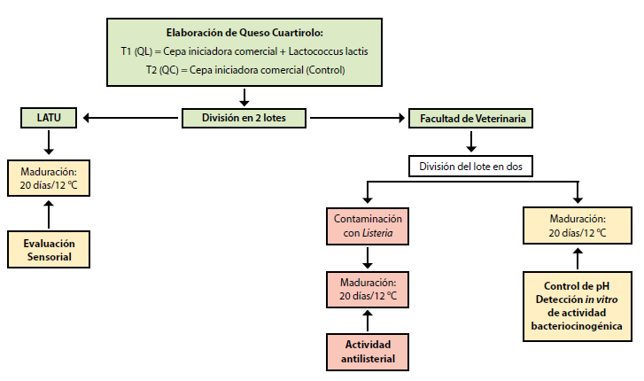 Se realizaron dos repeticiones de las elaboraciones de quesos. En cada una de ellas se utilizaron dos tratamientos: quesos elaborados con L. lactis autóctono (2.5x1010ufc/g) como cultivo adjunto (al que se denominó T1 o Queso Lactis: QL) y el tratamiento control donde no se lo incluyó (llamado: T2 o Queso Control: QC). La subdivisión de los lotes para la evaluación del efecto antilisterial (L. innocua en una concentración: 103ufc/g), detección in vitro de actividad bacteriocinogénica y evaluación sensorial de los quesos se indican en la Figura 1. Todos los ensayos fueron realizados por duplicado siguiendo el mismo proceso de elaboración.