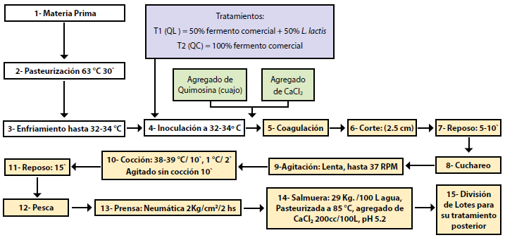 Se utilizaron un total de 80 L de leche, que se dividieron en dos lotes de 40 L, uno para cada tratamiento: T1 y T2. La elaboración se realizó de acuerdo al estándar para queso tipo Cuartirolo (Figura 2).