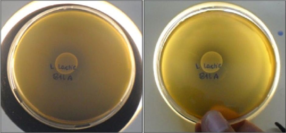 Por otra parte, se determinó en este cultivo la presencia de efecto inhibitorio sobre L. innocua, obteniendo un halo de inhibición de promedio 15 ± 1,41 mM de diámetro.