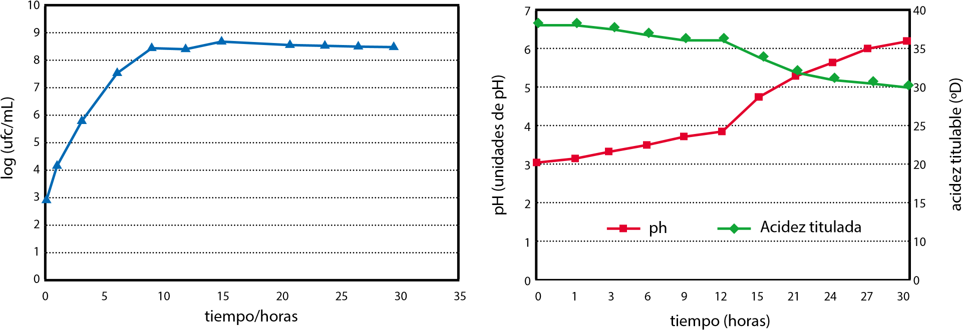 Curva de crecimiento (izquierda) y capacidad de fermentación (derecha) de L. lactis cultivado en leche a 30ºC