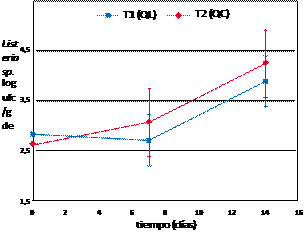 Los análisis del recuento en placa mediante ANOVA multifactorial en relación al efecto tratamiento evidenciaron diferencias significativas en los recuentos de L. innocua independientemente del tiempo (T1: 3,13 ±0,05 Log ufc/g; T2: 3,3 ±0,05 Log ufc/g; p<0,05). Sin embargo, estos resultados difieren en menos de una unidad logarítmica (0,17 Log ufc/g).