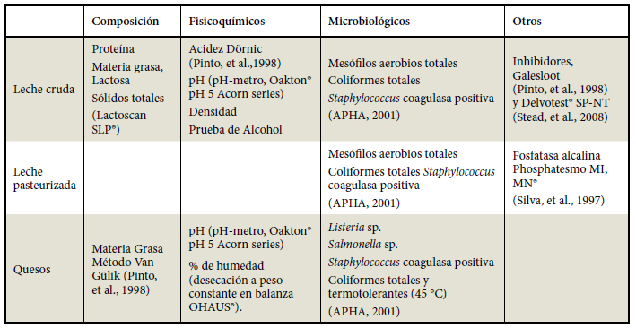 Durante la elaboración de los quesos y luego de su maduración se retiraron muestras para análisis de calidad microbiológica y de composición. Los análisis y técnicas se especifican en la Tabla 1. Entre los análisis se incluyó la detección de Listeria sp. (APHA, 2001) para asegurar además su ausencia antes de inocular los quesos que serían contaminados.