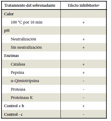 En este trabajo el SLC neutralizado y tratado con catalasa mantuvo la actividad antimicrobiana, lo que descarta que el efecto sea solo por la producción de ácido y peróxido de hidrógeno por parte de Lactococcus lactis. En contraposición, no se observó efecto antimicrobiano cuando el sobrenadante fue tratado con las enzimas α-quimotripsina, proteinasa K y proteasa.
