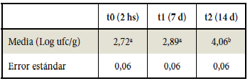 Los resultados obtenidos en el recuento de L. innocua considerando el efecto tiempo, independientemente del tratamiento, presentaron diferencias significativas a partir de los 14 días, lo que indica que durante los primeros 7 días este crecimiento no es significativo (Tabla 3).