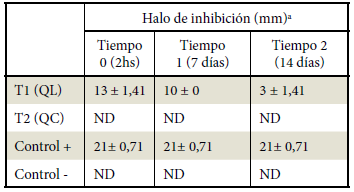 a Valores de la media de los diámetros de los halos de inhibición alrededor del pocillo inoculado ± SDb ND- No se detectan halos