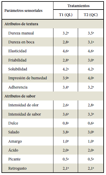 Los resultados obtenidos de la evaluación sensorial y su posterior análisis estadístico se observan en la Tabla 5. No se encontraron diferencias significativas entre ambos tratamientos en los atributos evaluados, a excepción del sabor salado. En ese caso la intensidad fue mayor en los quesos elaborados con L. lactis (QL).