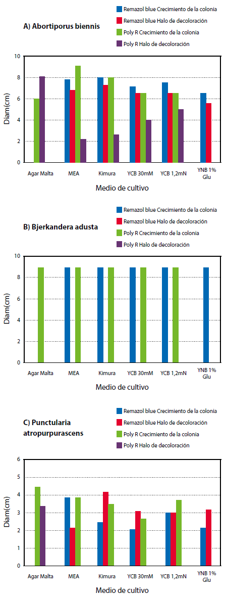 Medición del crecimiento y del halo de decoloración de Abortiporus biennis (A), Bjerkandera adusta (B), Punctularia atropurpurascens (C) en los medios de cultivo: Agar Malta, MEA, Kimura, YCB (Tartrato de amonio 30 mm), YCB (Tartrato de amonio 1,2 mm), YNB (1%Glu).