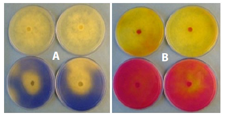 Decoloración de los colorantes Remazole-blue (A), y Poly-R (B) por Abortiporus biennis en el medio Agar Malta, a los tres (inferior) y seis (superior) días de incubación.