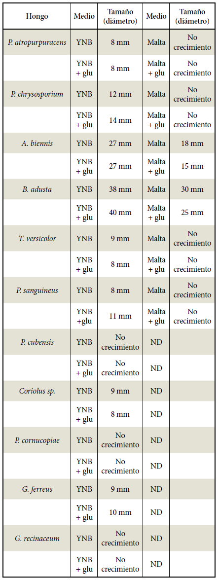 Se estudió la capacidad de producir enzimas ligninolíticas de los hongos seleccionados previamente en los medios, agar extracto de malta, MEA, YNB con glucosa e YCB con tartrato de amonio, a los cuales se les agregó RBB o Poly-R478 (Novotný, et al., 2004).