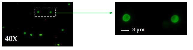 * Copias Génicas Estándar SembradasEl procesamiento de muestras ambientales en las que evaluar la presencia de Cryptosporidium sp. requiere de una primera etapa de concentración de los ooquistes potencialmente presentes en ellas. La estrategia seguida en este trabajo para la recuperación o concentración de ooquistes fue de filtración en membranas (Xiao, et al., 2000; Xiao, et al., 2000; DiGiorgio, et al., 2002; Ferguson, et al., 2004; Lee, et al., 2004; Wohlsen, et al., 2004). Para evaluar la robustez de este método, diluciones seriadas al medio de ooquistes comerciales de este protozoario fueron sembrados en 20 L de agua distribuida. Luego de la filtración, el material retenido fue eluído y el ADN correspondiente extraído y sometido a reacciones de PCR de tiempo real. Los resultados obtenidos mostraron una tendencia lineal con un R2 de 0,99 en la recuperación de ooquistes correspondientes a las diluciones seriadas evaluadas (Figura 7), lo que evidencia la robustez del método de recuperación. Para evaluar la significación sanitaria de la presencia ambiental de Cryptosporidium sp. no solo es fundamental determinar su concentración en las matrices analizadas y conocer la especie dominante presente sino también el grado de integridad de sus ooquistes. Para responder a esta interrogante en este trabajo se implementó un protocolo basado en microscopía de fluorescencia para la detección de ooquistes de este protozoario. El sistema implementado permite detectar de forma clara y específica ooquistes de Cryptosporidium parvum, ya sea presentes en solución comercial (Figura 8) o sembrados en aguas superficiales y recuperados por filtración en membrana (Figura 9). Es interesante apreciar en la Figura 8ooquistes con su envoltura comprometida doblemente teñidos por EB y FITC (UK Environment Agency, 2010).